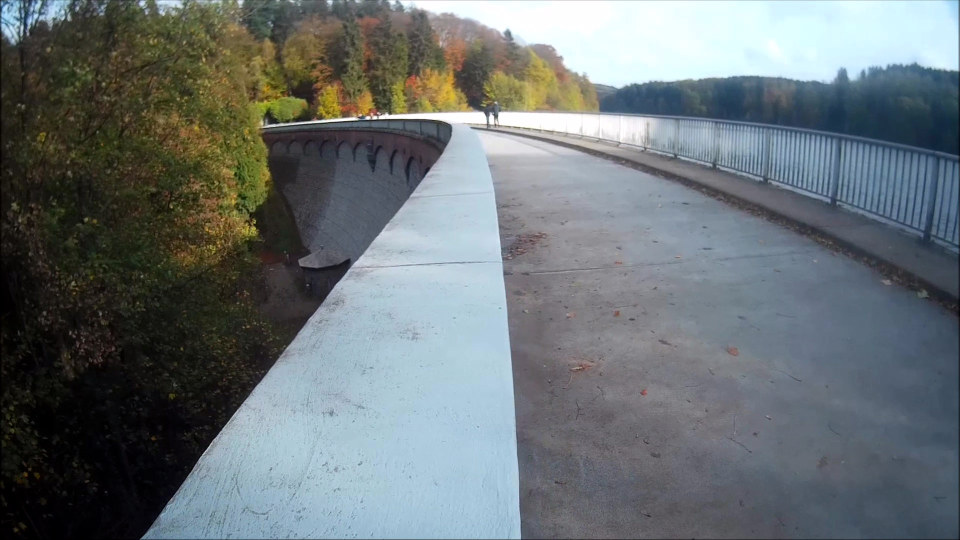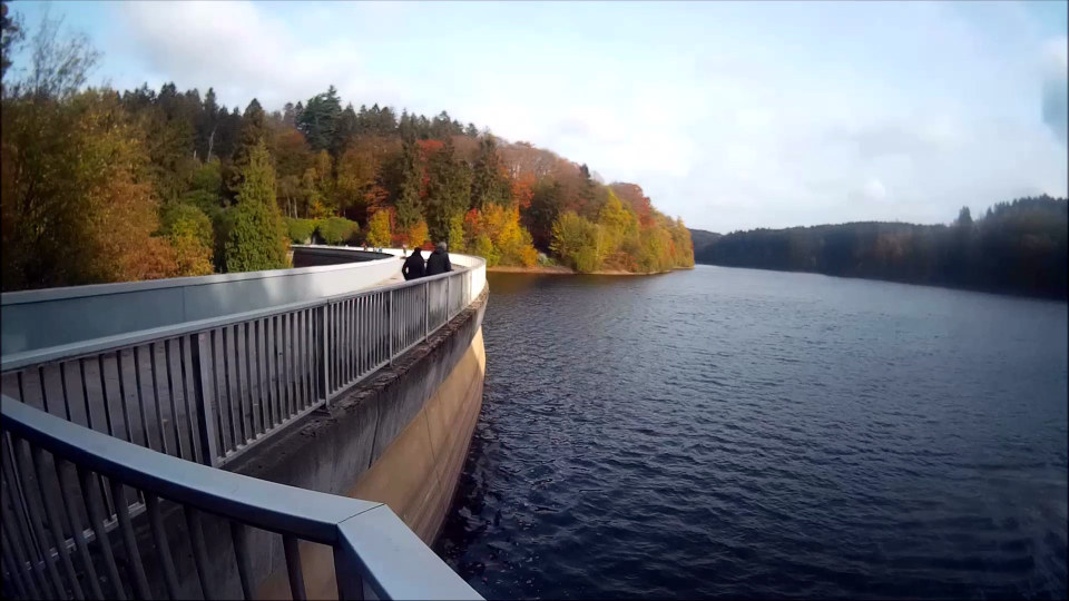 Kurz hinter dem Freibad, bei etwa km 44 passieren wir die Eschbachtalsperre, Deutschlands älteste Trinkwasser-Talsperre. Ein schönes Bild auf den See mit den dahinter liegenden Herbstwäldern. Das wäre also meine Runde beim 6-Stunden-Lauf im Juni gewesen: sechs Stunden in 3 km-Runden um den See, jeder wie weit ihn die Füße tragen. 2019… Angemeldet bin ich!