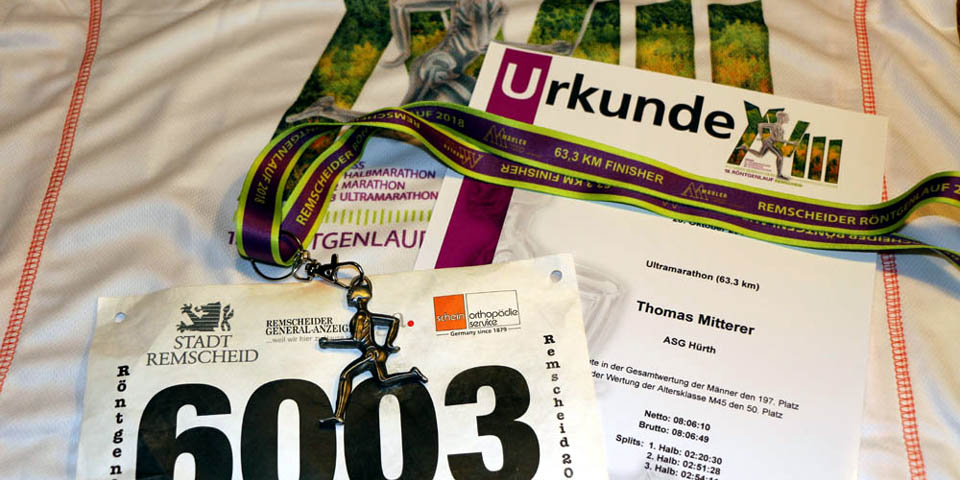 Kaum war die Anmeldung für den Röntgenlauf 2018 offen, hatte ich mich angemeldet und mir die Startnummer 6003 gesichert. Das motivierte. Zudem war ich für den 6-Std.-Lauf in Remscheid im Juni 2018 gemeldet: hier sollte die 50 km-Marke geknackt werden. Ich wollte vor dem Röntgenlauf wissen, wie sich das Laufen jenseits der Marathonmarke anfühlt. Und dann? Dann verlor mein Autoreifen auf der Anfahrt zum Wettkampf Luft. Das darf doch alles nicht wahr sein!!! So eine Sch… Ich habe am Steuer geflucht und bin vernünftig geblieben: runter von der Autobahn, Tanke, Luft aufgefüllt, zurück nach Hause, ab in die Werkstatt, danach war es natürlich zu spät für den Start. Ob an dem heißen Sommertag mit weit über 30°C fünfzig Kilometer möglich gewesen wären? Weiß ich nicht… Stattdessen das Positive gesehen: keine Regeneration nötig, direkt wieder ins Training eingestiegen und die lange Läufe wieder gesteigert. Trotz des Hitzesommers 20108 brav die nötigen Kilometer abgespult und im Herbst das Training mit zwei Marathons im Abstand von einer Woche abgeschlossen. Drei Wochen Tapering mit 50 km, 45 km und 12 km – fertig.