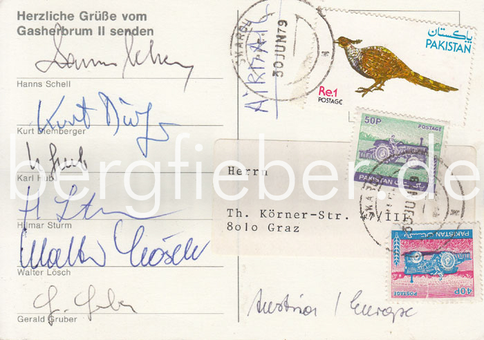 Am 31.7 erreichen Karl Hub, Hilmar Sturm und Reinhard Karl den Gipfel; am 4. August dann auch Hanns Schell, Kurt Diemberger, Walter Lösch, A. Schwab, Fayyaz Hussain und W. Weitzenböck. |